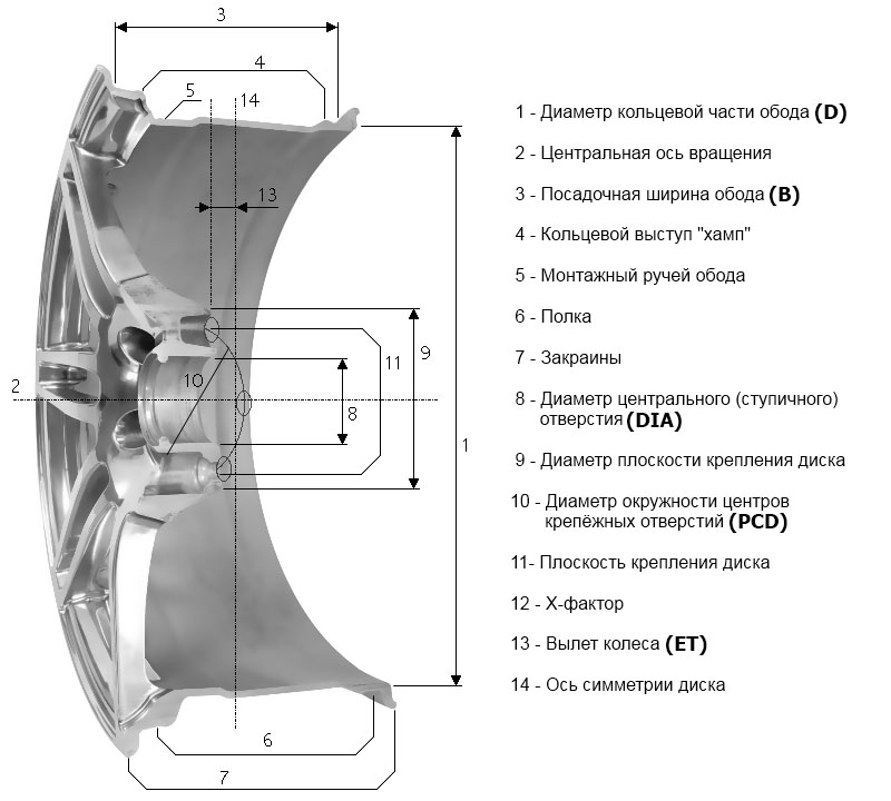 Этот параметр должен совпадать с посадочным диаметром шины. На шине написано R15 — значит, диск нужен 15 дюймов. Не больше и не меньше. Можно поставить диски большего диаметра (например, вместо 15 на 16), но тогда придётся ставить шины с меньшим профилем, чтобы внешний диаметр колеса остался прежним. Это отдельная тема (лифтинг).